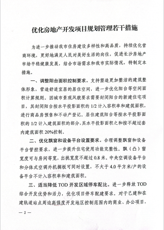 其實,當天長沙市房地產平穩(wěn)健康和安全運行協(xié)調小組也印發(fā)了另一則通知——《優(yōu)化房地產開發(fā)項目規(guī)劃管理若干措施》,事關項目報規(guī)建設等相關事項,條件對比前期技術規(guī)范多有調整,主要涉及陽臺、飄窗、TOD項目停車配比、社區(qū)配套用房、住宅商業(yè)配套比例和后置出讓金這個六個方面。