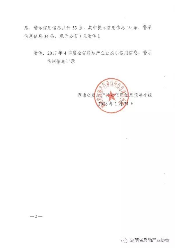湖南省房地產行業信用信息領導小組關于公布2017年4季度湖南省房地產企業提示信用信息警示信用信息的通知